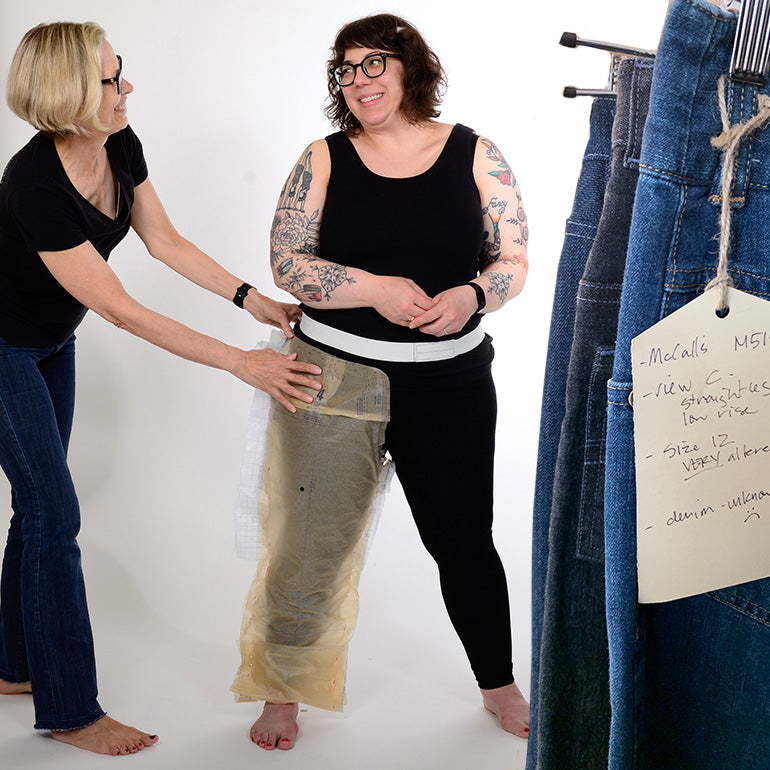 How do we do it? By fitting real women! Having long ago dispensed with tedious measuring or making a muslin to check the fit of a sewing pattern, we have mastered the process of tissue-fitting. This simply means "trying on" the pattern's tissue pieces to see where to alter the pattern for a custom fit.