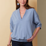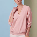 Loose tops have a wide front crossover neck band, wide sleeve bands and wide waistband. Views A and B have 3/4 sleeves and View C top has long sleeves. Front seaming has in seam pockets.