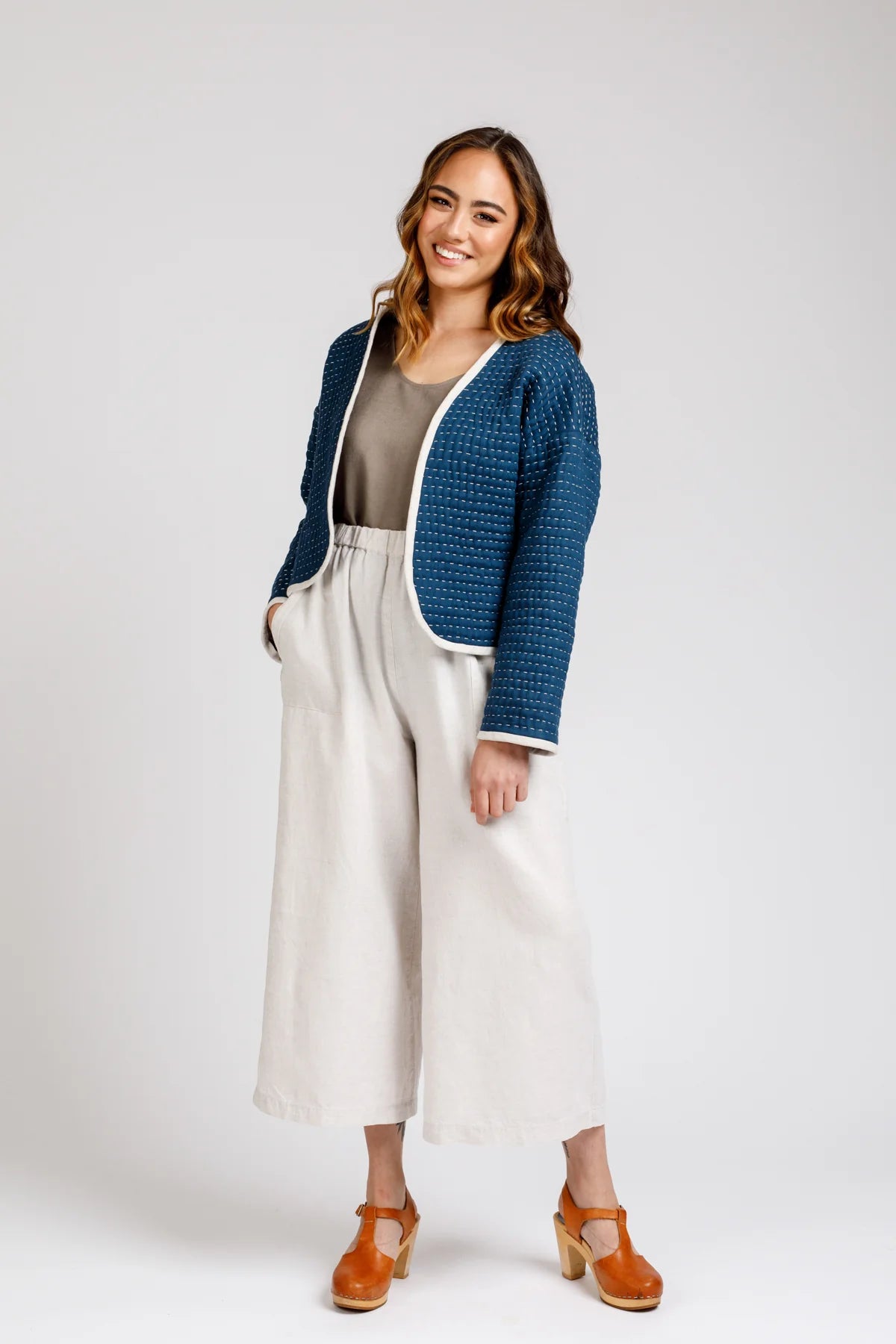 Suggested Fabrics: Light to medium weight fabrics such as cotton, linen, chambray, blends, etc. are recommended for quilted versions B, D, & F. Avoid thick fabrics or these versions can become bulky. Medium weight fabrics such as linen, cottons, etc. or medium to heavy weight coating fabrics such as boiled, felted, or suiting wool are recommended for Views A, C & E. Prequilted fabrics are suitable for all views.