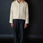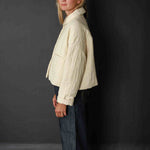 A natural ecru. This layered cotton has a jacquard weave that gives it a quilted look and feel.