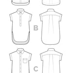 View A is cropped with a wide-faced hem, View B is a tunic length shirt inspired by classic men's oxfords, and View C is a stylish shirtdress with a high-low hem. All versions feature a subtly curved yoke, short dolman sleeves with arm cuffs, and a dramatically shaped hem.