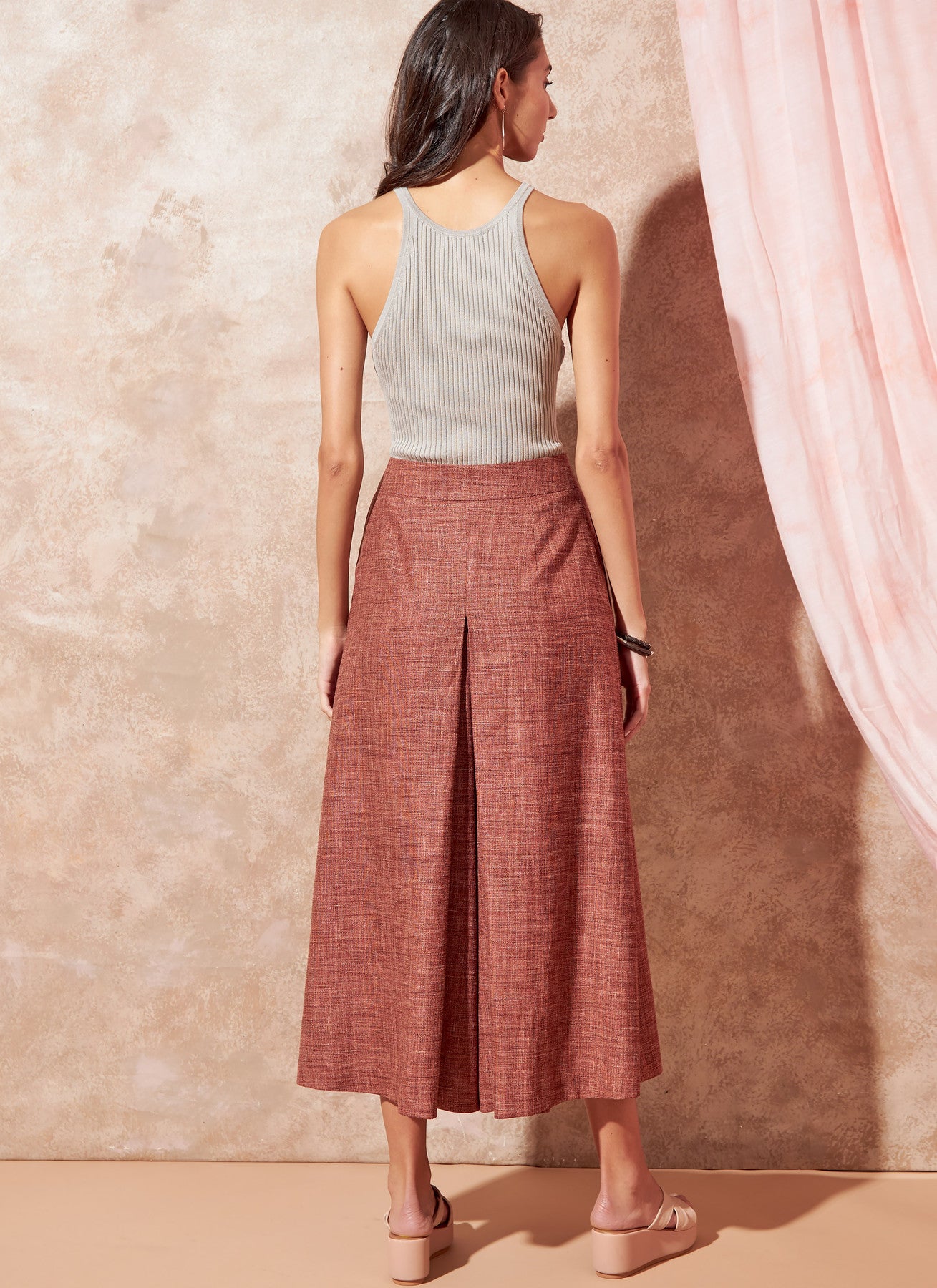 Melissa Watson for Palmer/Pletsch skirt, shorts and culotte have softly pleated front and back darts. All views have shaped waistbands with button openings on side and inset pockets.