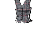 Lined button front blazer and vest combo adds instant polish to any outfit. Blazer has notched collar, button on sleeves, pockets with flaps, shoulder pads, optional sleeve head, and back vents. Vest has V-neckline, back buckled belt, and welt pockets.