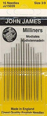 John James Milliner/Straw hand needles, Size 3/9. We carry packs containing size 3 to size 9. Each pack contains 16 sewing needles per package.