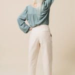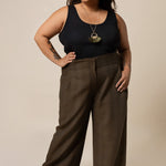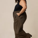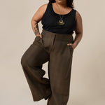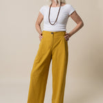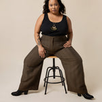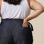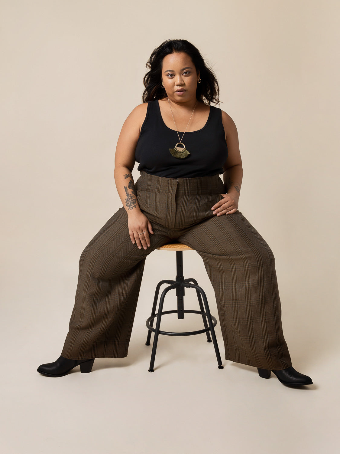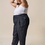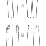 The Mitchell Trousers are high-waisted with a fly front zipper and a comfy hidden waistband facing for a sleek continuous silhouette through the rise–choose between a hidden pants hook and bar or classic button closure. Deep pleats in the front enclose a unique angled pocket. Darts shape the back, with optional back welt pockets. View A features a tapered leg ending at the ankle. View B features a full-length wide leg and adjustable waist straps secured with D-rings or sliders.