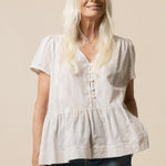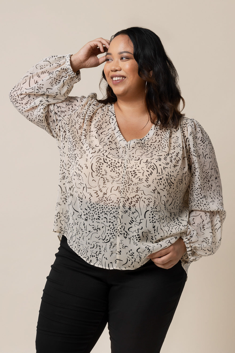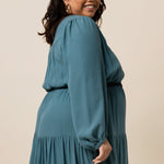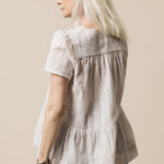 All views feature a loose-fitting V-necked bodice with a gently gathered shoulder and yoke. The slightly puffed sleeve is gathered at the shoulder; choose between a short sleeve, or a long sleeve with wrist pleats for shaping and an elastic gathered cuff. You may also choose between two interchangeable neckline finishes: a simple facing, or a bias-bound neckline with delicate rouleau button loops and buttons. View A is a button-front dress with a comfortable elastic waist, long or short sleeves, and three gathered skirt tiers. View B is a voluminous swing tunic with a gathered hip tier and long or short sleeves. View C is an elegant blouse with a faced neckline and long or short sleeves.