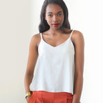 The Ogden Cami is a simple blouse that can either be worn on its own or as a layering piece under blazers and cardigans. It has a soft V neck at both center front and center back necklines, and delicate spaghetti straps. The neckline and armholes are finished with a partial lining for a beautiful, high end finish.