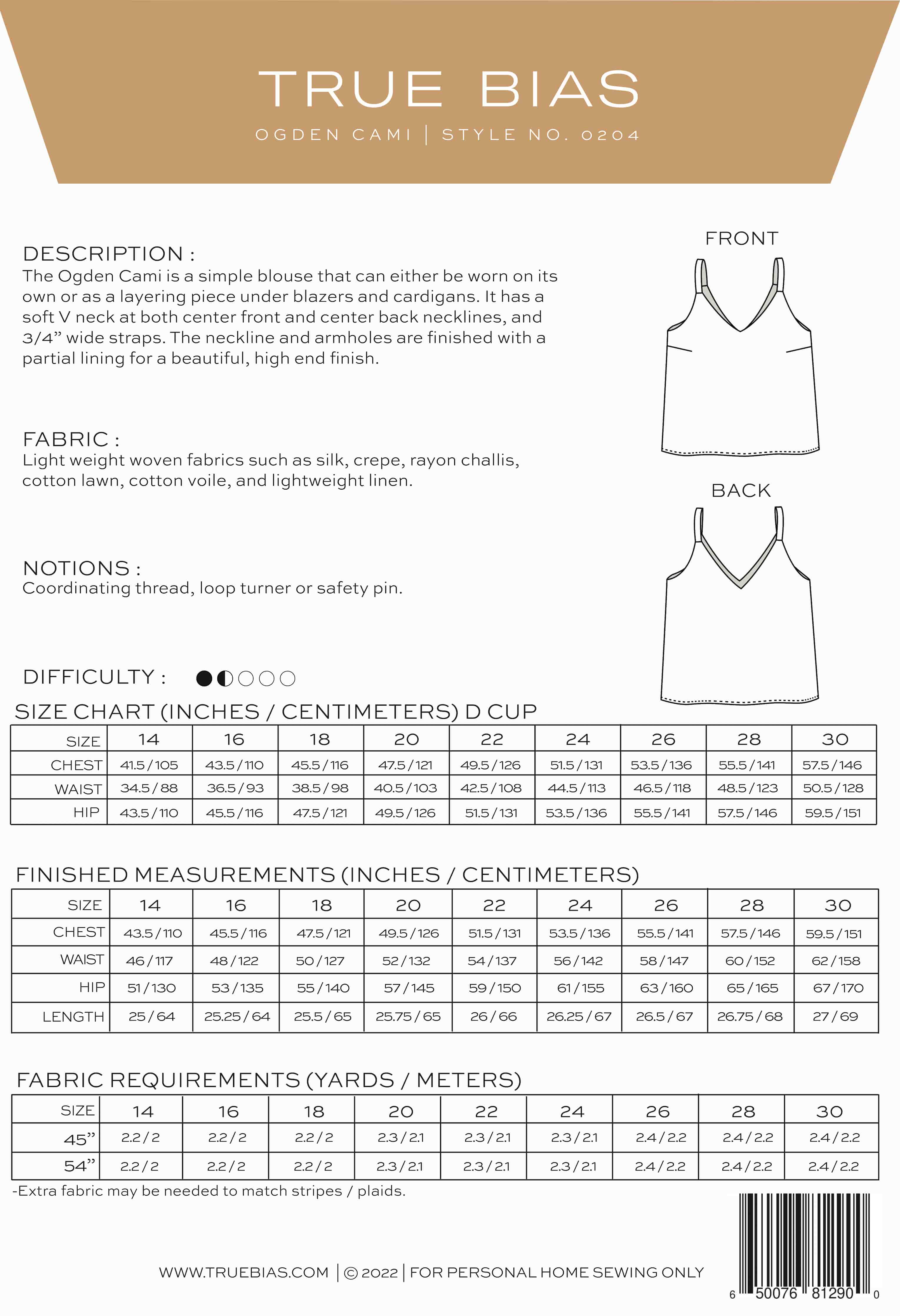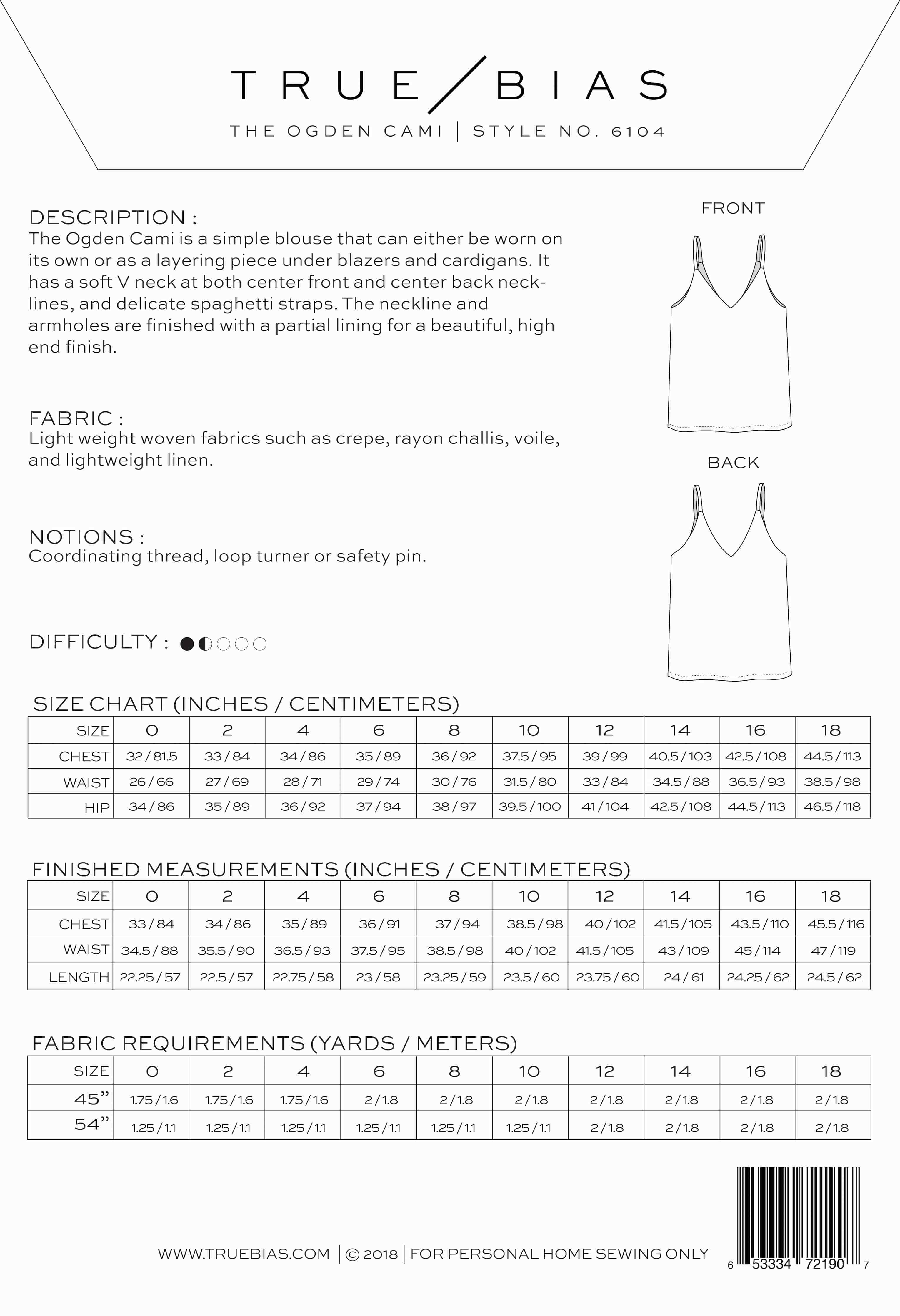 Suggested Fabrics: Light weight woven fabrics such as silk, crepe, rayon challis, cotton lawn, cotton voile, and lightweight linen.